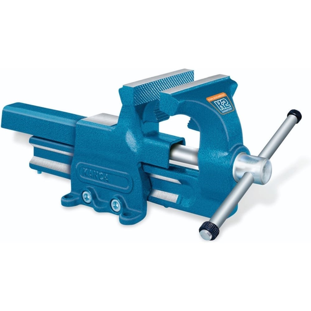 Губки и корпус изготовлены из высококачественной стали (CF45) методом горячей ковки. Они обладают исключительной ударной прочностью. Наковальня тисков (твердость 50–55 HRC) и зажимные губки (твердость 50–58 HRC) закалены специальным индукционным методом. Зажимные губки изготовлены из кованой стали и благодаря специальному углу расположения зубьев обеспечивают надежный захват материала и предотвращают проскальзывание даже в самых сложных условиях эксплуатации. Ходовой винт и гайка имеют ускоренную конфигурацию, позволяющую совершать зажим деталей и разъединение губок в два раза быстрее стандартной комплектации у таких же тисков. Направляющая рельса и регулировочные болты позволяют избежать люфта губок. Поворотное основание приобретается отдельно.