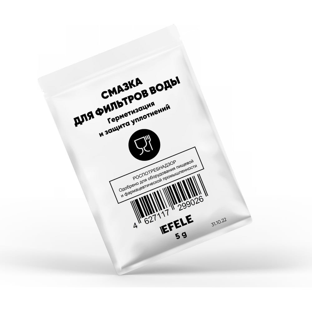 Смазка для фильтров воды EFELE с пищевым допуском NSF H1 0099026 – специальный смазочный материал для уплотнений фильтров систем водоснабжения. Благодаря специальной рецептуре материал облегчает монтаж и демонтаж уплотнений, снижая риск повреждений, придает им дополнительную герметизацию и защиту от усыхания (потери эластичности). Вследствие этого минимизируется риск протечки и увеличивается срок службы уплотнений и надежность системы в целом. Соответствует Единым санитарно-эпидемиологическим и гигиеническим требованиям к продукции (товарам), подлежащей санитарно-эпидемиологическому надзору (контролю) – Федеральная служба по надзору в сфере защиты прав потребителей и благополучия человека. Экспертное заключение от 26.02.2021 № 77.01.12.П.000509.02.2021.
