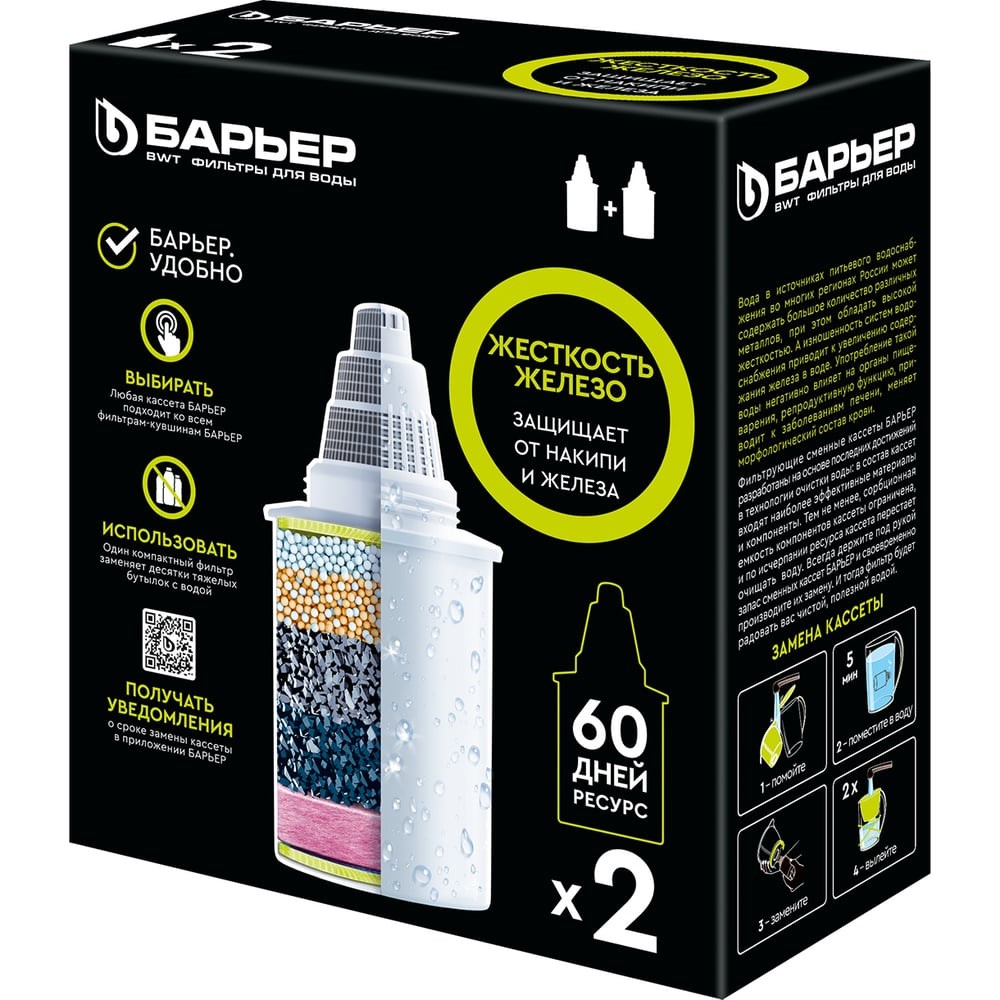 Комплект кассет для фильтров-кувшинов БАРЬЕР жесткость, железо, 2 шт, защищает от накипи и железа К302Р00 позволяет забыть о накипи и желтых разводах на чайнике. Удаляет неприятный железистый привкус воды. Резьбовое соединение надежно фиксирует кассету и не дает попасть нефильтрованной воде в чистую. Ресурс зависит от качества исходной воды, но составляет не более 350 литров. Одна кассета БАРЬЕР способна заменить несколько сотен пластиковых бутылок. По окончанию ресурса кассеты можно сдать на переработку.