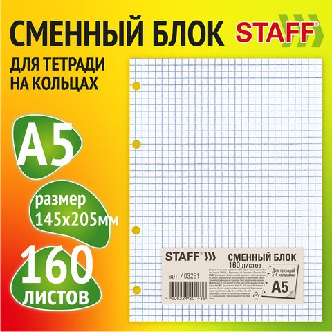 Сменный блок для тетради на кольцах, А5, 160 л., STAFF, "Белый", 403261