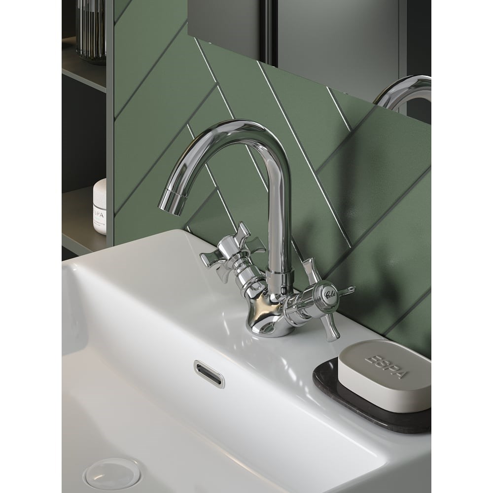 Двухзахватный смеситель для раковины с поворотным изливом Agger Retro-X A1701100 – элегантная классика и безупречное немецкое качество. Высокий поворотный излив удобен для проведения ежедневных процедур. Встроенный аэратор экономит воду, делает струю мягкой и исключает разбрызгивание. Для плавного регулирования напора и температуры воды предусмотрены два надежных вентиля (керамические кран-буксы). Хромовое покрытие, за которым очень просто ухаживать мягкой салфеткой, обеспечивает блеск поверхности на долгие годы.