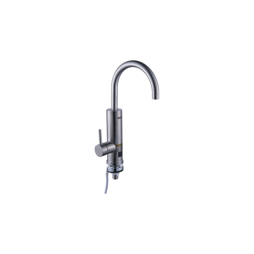 Смеситель для кухни Potato с высоким изливом и с электронагревом P0051 является нагревателем проточного типа. Предусмотрена возможность регулировать температуру воды по своему усмотрению. Просто поверните ручку, и вода поменяется от теплой до горячей. Кран водонагреватель прост в установке. Не нужно никакого специального монтажа, или специальных знаний. Просто снимите старый кран, и поставьте кран-водонагреватель. Несмотря на большую мощность водонагревательного крана, он расходует значительно меньше электроэнергии, чем бойлер или другой водонагреватель. При этом его КПД выше, воду он греет быстрее, а пользоваться им приятнее. По внешнему виду такой кран мало отличается от обыкновенного смесителя: существует провод для подключения к электрической сети, а размеры прибора немного больше обычного. В смесителе расположен нагревающий элемент, а также аппаратура, обеспечивающая электробезопасность работы. Нагрев холодной воды происходит с помощью электронагревательного элемента, за счёт преобразования электрической энергии в тепловую в камере нагрева, расположенной в корпусе крана до температуры +60 С. При нагреве воды до данной температуры уменьшается риск образования накипи и ожогов тела при использовании горячей воды.