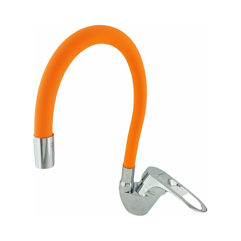 Смеситель для кухни Rainsberg с гибким силиконовым изливом, оранжевый R3193F-4 - эксклюзивная модель с гибким цветным изливом. Ручка позволяет без лишних усилий настроить напор и оптимальную температуру воды. Гибкий излив значительно расширяет зону использования смесителя. Он изготовлен из термостойкого силикона, который абсолютно безопасен при контакте с водой благодаря отсутствию токсичных компонентов в составе. Излив обладает повышенной износостойкостью и устойчив к перегибам.