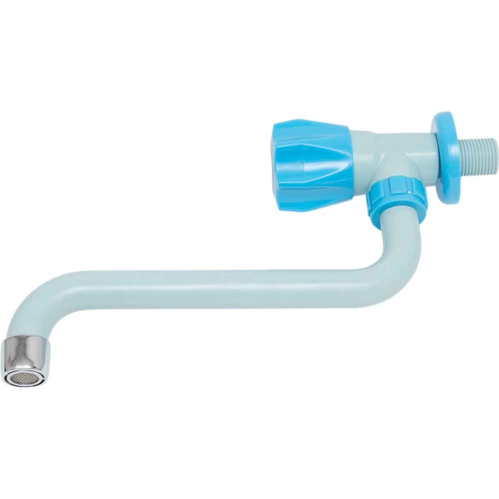 Кран для подачи одной воды из ABS пластика с высоким поворотным изливом. Может использоваться в помещениях со 100% влажностью в отличие от металлических аналогов. Легко монтируется и имеет широкий спектр применения. Гарантия 2 год. Кран для холодной воды, из высокопрочного ABS пластика, настенное крепление. Кран-букса, угол поворота 90 градусов. Аэратор: пластик. Цвет покрытия корпуса: голубой. Крепление: настенное. Рекомендуется использовать при давление не более 2 Атм.