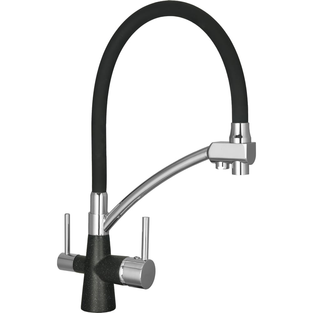 Смеситель для кухни WISENT с гибким изливом и подводкой питьевой воды /черный/ 4855-22-2 оригинальный, невероятно удобный и долговечный смеситель с подводкой для питьевой воды. Корпус изготовлен из латуни. Материал выдерживает высокие и низкие температуры и легко чистится от загрязнений.
