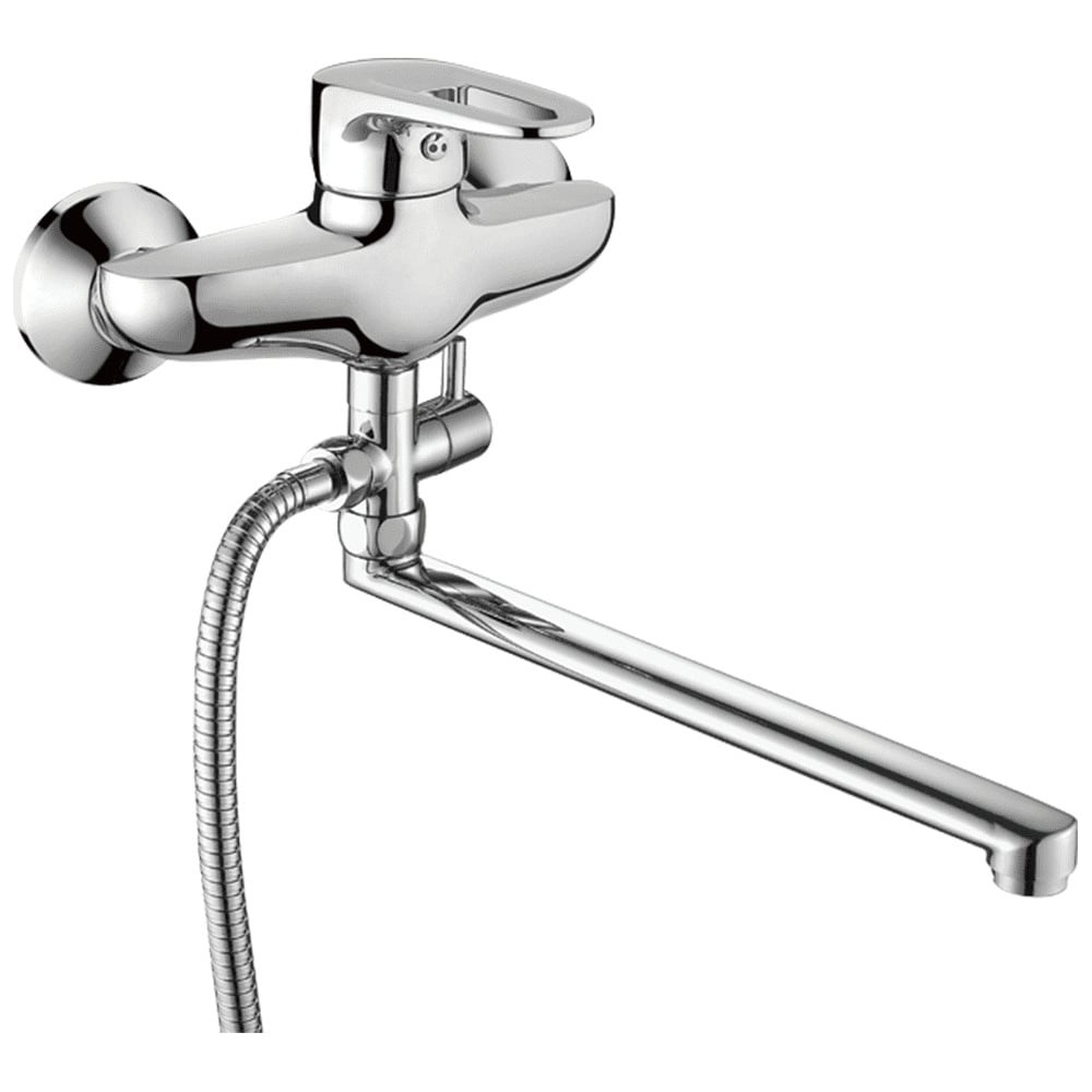 A2168 смеситель ванно-душевой с душевым гарнитуром хром латунь, картридж D=40 мм излив: L=270 мм, поворотный установочный комплект + ручная лейка: ABS пластик, D=75 мм, 5 режимов, хром держатель настенный: ABS пластик, хром шланг: L=1500 мм, оплётка сталь SUS201, хром