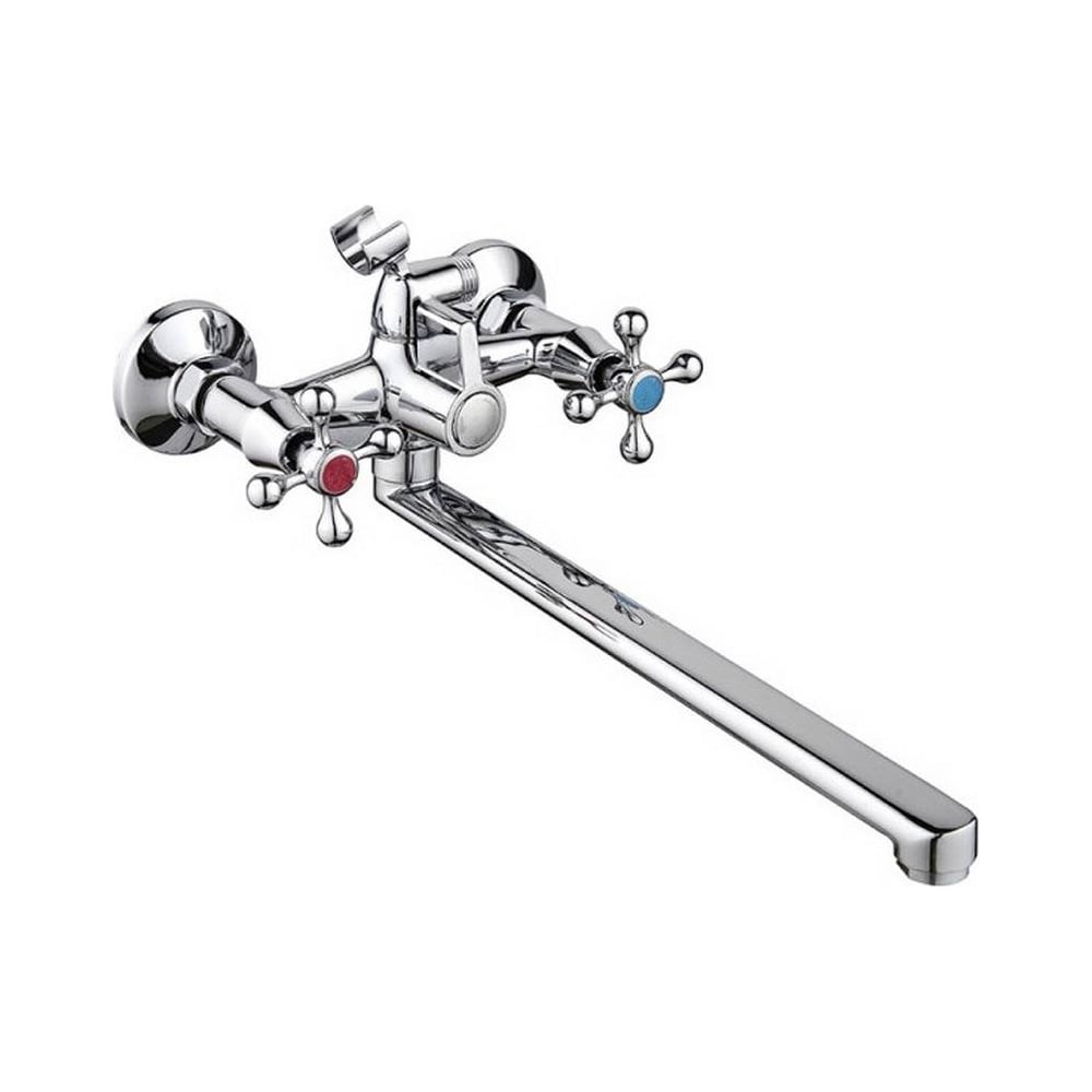 Смеситель для ванны и душа двухвентильный, с L-образным поворотным изливом длиной 35см, шлангом для душа и лейкой.Покрытие хромАэратор латунный с функцией лёгкой очисткиКран-буксы латунные, с керамическими пластинамиВстроенный поворотный дивертор: кран-букса