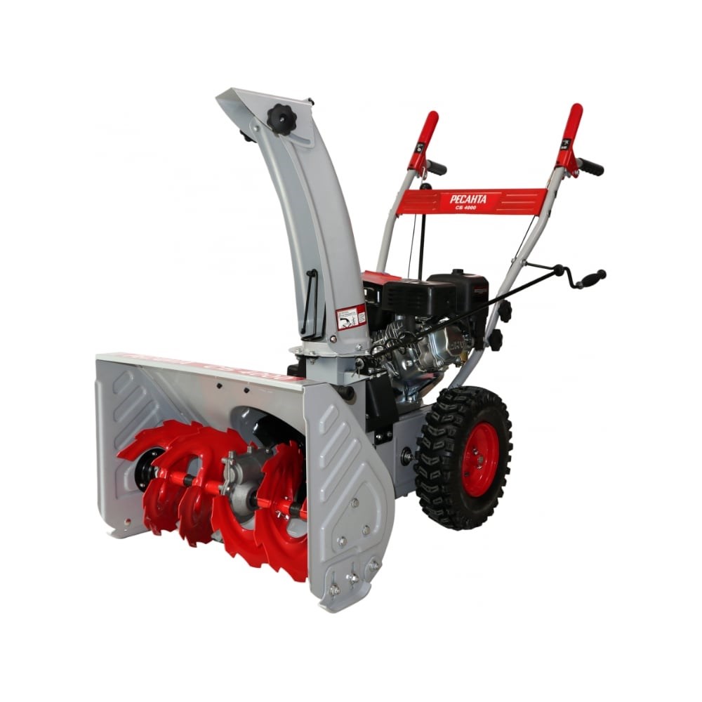 Снегоуборщик бензиновый СБ 4000 Ресанта идеально подходит для владельцев небольших участков загородных домов и коттеджей. Легко справляется с расчисткой снега на дорожках и площадках при умеренном количестве осадков. Колесный самоходный агрегат отлично справляется даже с удалением плотного и мокрого снега, так как оснащен металлическим шнеком для измельчения. Базовая модель не имеет дополнительных функций, но хорошо справляется с основным назначением.Рабочая система СБ 4000 Ресанта имеет простое устройство. Основу конструкции составляет снегозаборочный желоб со шнеком. За выброс осадков в виде снега также отвечает специальный желоб и вентилятор с крыльчаткой. За один проход снегоуборщик способен расчищать полосу шириной 56 см.За хорошую производительность агрегата отвечает 4-тактный двигатель мощностью 7 л.с., работающий на бензине. Перегрев двигателя не допускает воздушное охлаждение.Модель имеет стандартное количество скоростей: 4 вперед и 2 назад. Для удобства эксплуатации рычаги изменения скорости и управления выбросом снега находятся на панели оператора.