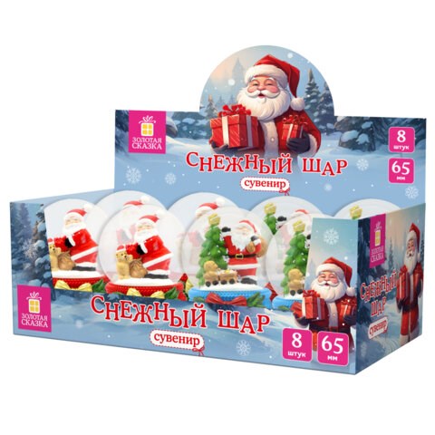 Диаметр – 6,5 см. Высота – 9.5 см. Состав: полистоун, стекло, вода, пропиленгликоль. Поставляется в 2 дизайнах (без возможности выбора). Упакованы в красочный дисплей с новогодним дизайном.