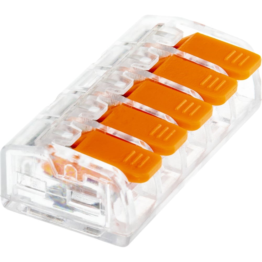 Cоединительные монтажные клеммы duwi СМК 223-415, 0,5-4мм2, прозрачная являются полным аналогом клемм WAGO/ВАГО. Прозрачные 5-х контактные клеммы подходят для соединения моножильных и многожильных проводов, защищая их от повреждения и исключая возможность замыкания. Моножильные провода достаточно только зачистить, а многожильные - нужно обжать наконечником для наилучшего соединения контактов. Рычажки предназначены для надежного зажима кабелей. Клеммы используются в целях переменного и постоянного тока с напряжением до 450В. Номинальный ток: 32 А. Прозрачный корпус позволяет отследить качество соединения. Сечение жесткого проводника 4мм2. Клеммы duwi выполнены из негорючих материалов - термостойкий пластик, а специальные пазы в корпусе исключают возможность случайного отсоединения проводников. Рабочая температура составляет от -25С до +85С. Набор клемм из 5 штук упакован в пакет с многоразовым замком, который легко открыть и закрыть. Это позволит сохранить порядок при ремонтных работах и при хранении клемм.