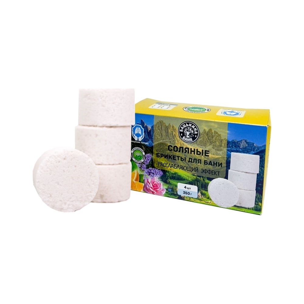 Соляные брикеты для бани Бацькина баня Расслабляющий эффект 350 г 23003 - натуральная соль для бани с эфирными маслами апельсин, бергамот, роза, сирень. Общий вес соли для бани - 350 г. Количество брикетов в упаковке: 4 шт. Соляной брикет для сауны изготовлен из морской природной соли, с полезным комплексом макро- и микроэлементов. Соляные пары улучшают кровообращение. Ионы морской соли проникают в кровеносную систему и ускоряют доставку питательных веществ и кислорода в организме, что приводит к укреплению иммунитета, способствуют очищению дыхательных путей, стимулируют потоотделение, позволяя ускорить процесс вывода токсинов, улучшают состояние кожи и помогают снять стресс и напряжение! Один соляной брикет для бани рассчитан на объем парной: 4-6 м2.