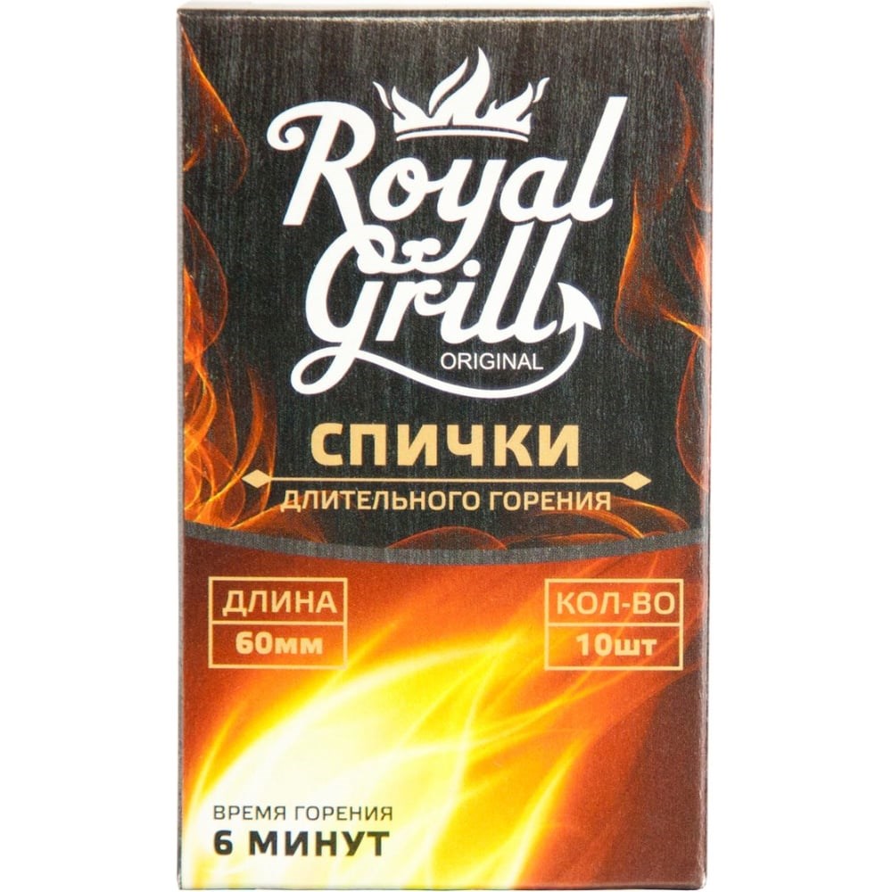 Спички длительного горения ROYALGRILL, 60 мм, 10 шт., 80-137 эффективны при розжиге огня в экстремальных условиях. Изготовлены из древесно-волокнистой плиты (ДВП). На край каждой спички нанесена смесь парафинов. Время горения одного изделия составляет 6 минут. В упаковке предусмотрено 10 спичек длиной 60 мм каждая.