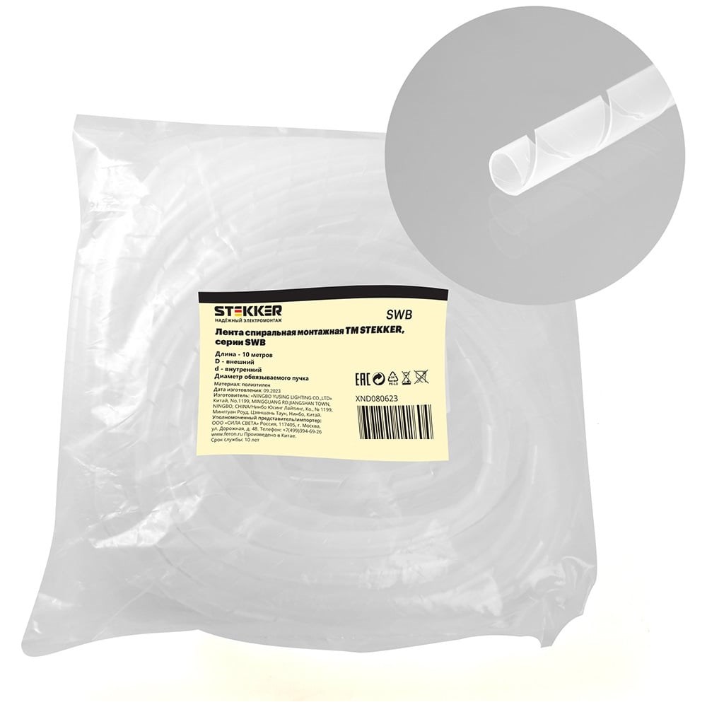 Лента спиральная монтажная SWB-06 представляет из себя ленту из полиэтилена, закрученную в спираль, длиной 10 метров. Спираль даёт возможность аккуратно скреплять проводку внутри кабельных каналов, металлических лотков и распределительных шкафов. Сферы применения: - вязка и защита кабеля при производстве кабельной продукции, электронной промышленности, в шкафах управления и коммутации; - для эффективной и чистой связки и прокладки кабелей, проводов, кабельных жгутов; - для защиты кабелей от трения или других повреждений, а также для придания жесткости.