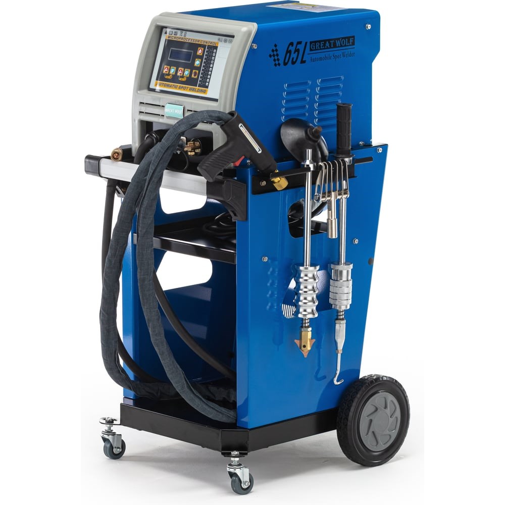 Споттер Great Wolf GW-65L 220 для контактной точечной сварки и выпрямления стальных поверхностей с микропроцессорным управлением и автоматическим вводом параметров сварки в зависимости от инструмента и толщины металлического листа. Понятный дисплей и кнопочная панель обеспечивают удобное использование аппарата. Оснащен автоматической защитой от перегрева. Применяется в кузовных цехах авторемонтных предприятий.