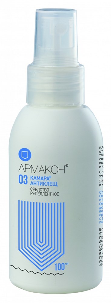 СПРЕЙ:КАМАРА® АНТИКЛЕЩ АРМАКОН Средство репеллентное - Защищает от нападений клещей, в том числе иксодовых (переносчиков возбудителей клещевого энцефалита и болезни Лайма)и кровососущих насекомых: комаров, мокрецов, москитов, мошки, слепней, блох. - Время защитного действия: при нанесении на кожу - более 4 ч; при на несении на одежду - до 30 суток от насекомых и до 5 суток от иксодовых клещей (при хранении в полиэтиленовом пакете). - Эффективность средства подтверждена НИИ ДезинфектологииРоспотребнадзора. - В состав добавлены смягчающие компоненты. -Не содержит силиконов, красителей, парабенов. Упаковка: флакон 100 мл.