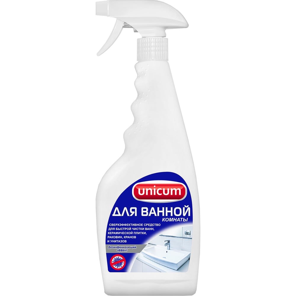 Спрей для чистки ванной комнаты UNICUM 0.5 л 300070 - высокоэффективное средство для чистки и обновления оборудования ванных и туалетных комнат — эмалированной и фарфоровой сантехники, изделий из нержавеющей стали, унитазов, биде, раковин, кафельных покрытий и пластиковых панелей.Средство мгновенно удаляет следы мыла, известковый налет, ржавчину, мочевой камень, плесень и грибок, удаляет неприятные запахи, придает блеск и оставляет защитный слой, препятствующий последующим загрязнениям.СПОСОБ ПРИМЕНЕНИЯ:Нанести средство с помощью распылителя с расстояния 20-25 см на очищаемую поверхность, подождать 15-20 секунд, протереть щеткой или тряпкой и смыть водой. В случае особо стойких загрязнений — повторить действие, увеличив время обработки до 1 мин.