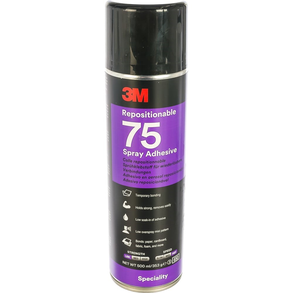 Переклеиваемый клей-спрей 3М 75, прозрачный 7000116775 предназначен для временного или предварительного склеивания материалов. Состав не твердеет с течением времени. Клей применяется в общей и текстильной промышленности, в печати, в работе с сувенирной продукцией и т.п.