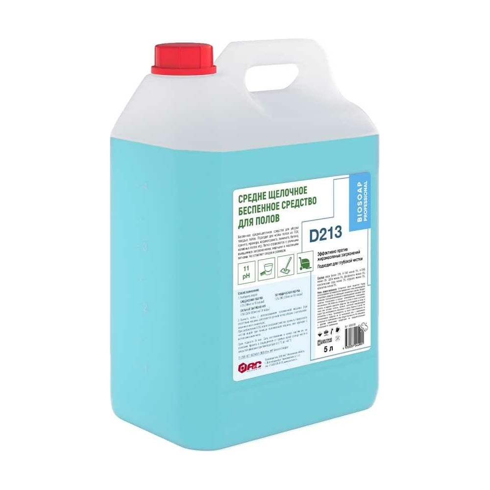 Среднещелочное беспенное средство для полов АиС BIOSOAP Proffecional / D213 5л 9060195 подходит для мойки полов из ПВХ, гранита, мрамора, керамогранита, ламината, бетона, наливных полов и тд. Легко справляется с уличными въевшимися загрязнениями, жирными и масляными пятнами. Не оставляет следов и разводов.Применение:Разбавить водой: ЕЖЕДНЕВНАЯ УБОРКА 0,5% (50мл на 10л воды), ПЕРИОДИЧЕСКАЯ УБОРКА 1-2% (100-200мл на 10л воды); СИЛЬНЫЕ ЗАГРЯЗНЕНИЯ 3-5% (300-500мл на 10л воды).Вымыть полы с использованием поломоечной машины (при отсутствии машины допускается ручной метод уборки с использованием моечного инвентаря). При разбавлении 3-5%, после основной очистки, промыть поверхность чистой водой при помощи поломоечной машины или вручную с использованием мопа.
