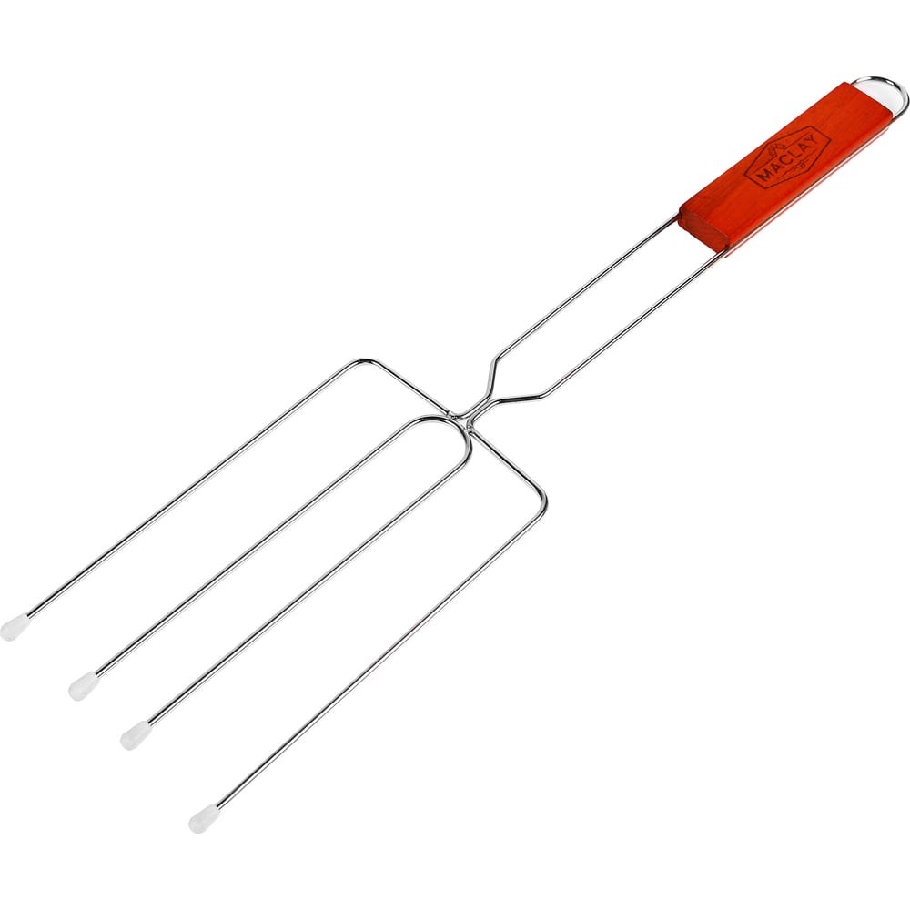 Вилка гриль для сосисок Maclay Lux, средняя, 50х12 см 2747665 предназначена для зажарки сосисок или купат на мангале, гриле, открытом костре. Выполнена из прочной хромированной стали, устойчивой к коррозии. Деревянная рукоять защищает от ожогов, удобна для захвата.