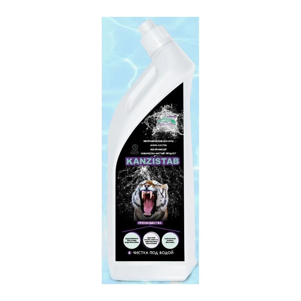 Химия для бассейна КАНЗИСТАБ без слива воды, уборка бассейна от налета, известковых отложений, чистка фильтра, 0.8 л 809400 для уборки бассейна без слива воды: От известковых отложений/высолов; Чистка фильтра с песком или стеклом; Пригоден для питьевой воды; Сертификат экологической безопасности; Не изменяет физико-химические параметры воды. Для удаления известковых отложений: Нанести в небольшом количестве на загрязнения и оставить (от 20 минут); Не допускать высыхания, смывать водой; Расход 100-200 мл на 1 м. Для чистки фильтра: Отключить фильтр от питания; Добавить 1 л средства на 100 кг песка; Оставить на 30-40 минут; Подключить фильтр; Осуществить промывку; Очистка фильтра должна производиться с периодичностью не реже 1 раза в 6 месяцев эксплуатации бассейна, при консервации/расконсервации бассейна, при простое фильтра более 5 суток без использования.