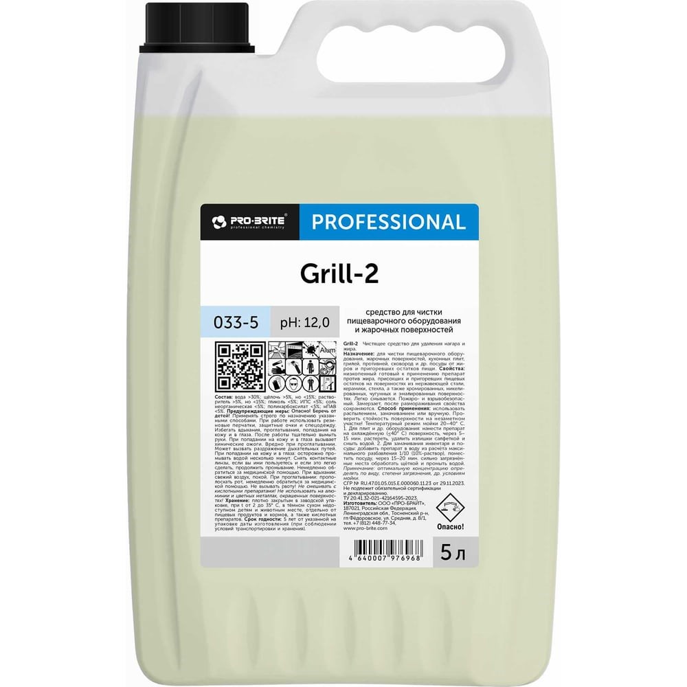 Средство GRILL-2 Чистящее средство для удаления нагара и жираНазначение:Средство для чистки пищеварочного оборудования и жарочных поверхностей.Для чистки пищеварочного оборудования, жарочных поверхностей, кухонных плит, грилей, противней, сковород и др. посуды от жиров и пригоревших остатков пищи.Область применения:Организации общественного питания, включая столовые школьных и дошкольных учреждений, пищевые производства.Свойства:Жидкий низкопенный готовый к применению препарат против жира, присохших и пригоревших пищевых остатков на поверхностях из нержавеющей стали, керамики, стекла, а также хромированных, никелированных, чугунных и эмалированных поверхностях. Легко смывается. Пожаро- и взрывобезопасный. Замерзает, после размораживания свойства сохраняютсяСпособ применения:Способ применения: использовать распылением, замачиванием или вручную. Проверить стойкость поверхности на незаметном участке! Температурный режим мойки 20–40° С. 1. Для плит и др. оборудования: нанести препарат на охлаждённую (ниже 40° С) поверхность, через 5–15 мин. растереть, удалить излишки салфеткой и смыть водой Примечание: оптимальную концентрацию определять по виду, степени загрязнения, типу поверхности и др. условиям мойки.Предупреждающие меры:Опасно! Беречь от детей! Применять строго по назначению указанными способами. При работе использовать резиновые перчатки, защитные очки и спецодежду. Не смешивать с кислотными препаратами! Не использовать на алюминии и цветных металлах, окрашенных поверхностях!