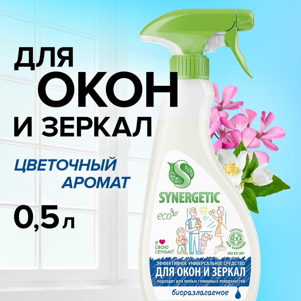 Средство для мытья окон, зеркал, мебели и бытовой техники SYNERGETIC 500 мл 4613720439027 107052 — эффективное и универсальное средство для бережного очищения стеклянных, зеркальных и других глянцевых поверхностей. Не требует смывания, улучшает светопроницаемость стекла. Комплекс мягких биоразлагаемых Н-тензидов и изопропилового спирта высокой степени очистки обеспечивает высокое качество уборки стеклянных и глянцевых поверхностей, быстро и эффективно удаляя загрязнения без разводов. Средство обладает антибактериальным действием. Гипоаллергенная отдушка на основе эфирных масел герани, мирта, жасмина и ветивера придает средству и очищенным поверхностям приятный цветочный аромат, который подходит даже для людей с чувствительной кожей. Продукт сертифицирован международным институтом этической и экологической сертификации ICEA. Средство подходит для септических установок. Попадая в среду септика, оно «понятно» для микроорганизмов и без труда распадается на простые соединения.