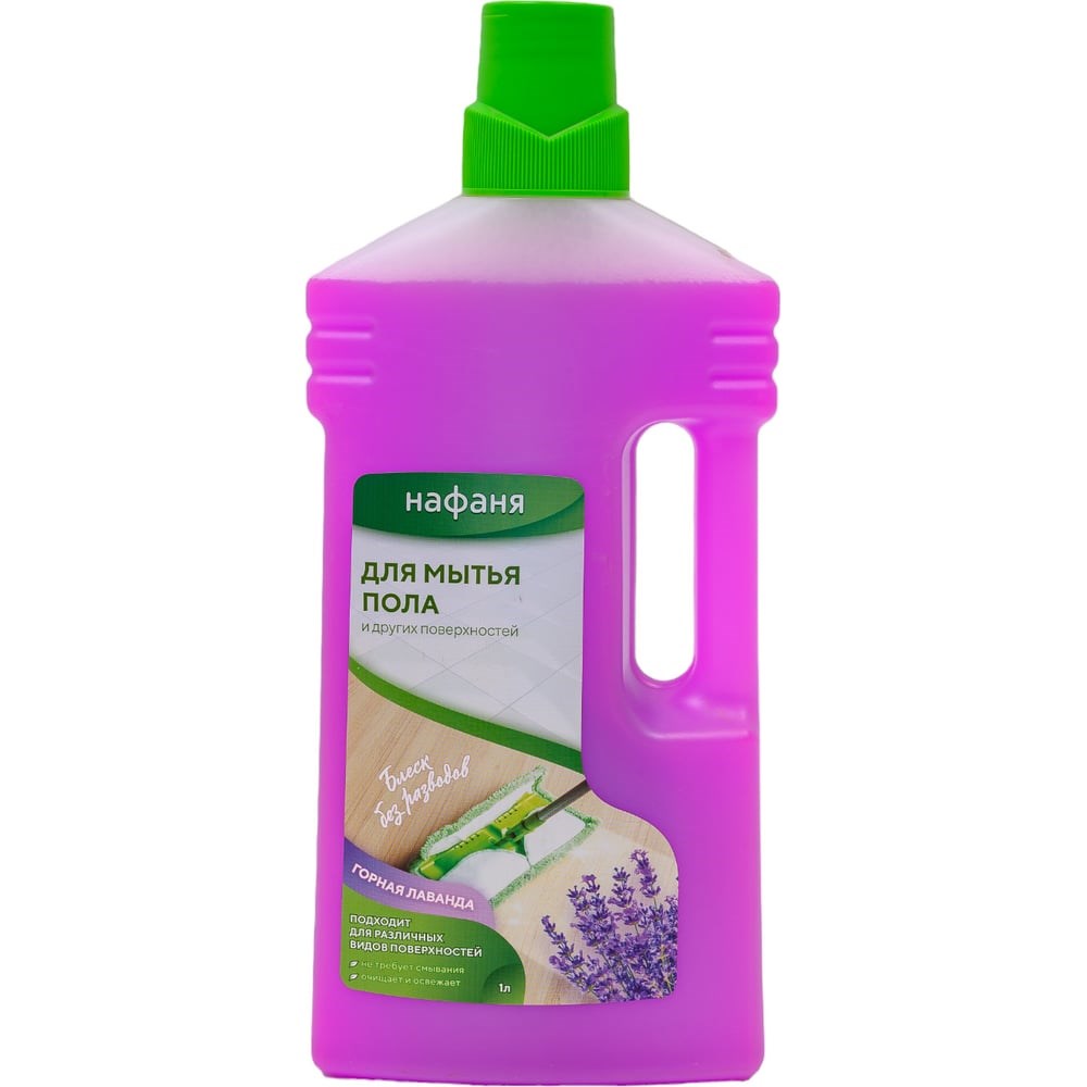 Средство для мытья полов Нафаня Универсал Горная лаванда 1000 мл НМП- 02 предназначено для очистки полов различного типа. Подходит для квартир, вольеров, будок, питомников и других помещений. Устраняет неприятные запахи, и пятна. Дезинфицирует поверхность пола. Придаёт приятный аромат помещению. Не требует смывания водой. Быстро высыхает, не оставляя следов. Не вызывает аллергии у животных. Безвредно для человека. Способ применения: Развести 40 мл или 1 колпачок средства на 8 л воды. Не требует смывания. При сильных загрязнениях возможно увеличение концентрации раствора или применение неразбавленным.
