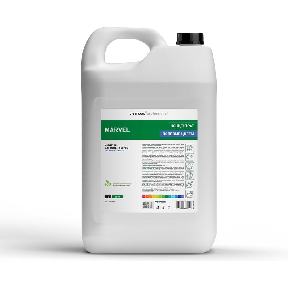 Средство для мытья посуды CleanBox Marvel Полевые цветы (Марвел) 5 л 1320518 предназначено для мытья посуды и кухонного оборудования.Средство хорошо пенится, за счет чего имеет экономичный расход.Полностью смывается с обрабатываемой поверхности, что позволяет сэкономить время.Полностью разлагаемо, поэтому безопасно для окружающей среды.