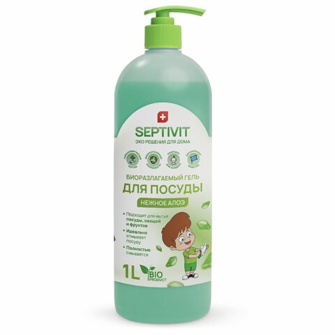 Средство для мытья посуды гипоаллергенное 1 л, SEPTIVIT "Нежное алоэ", биоразлагаемый, дозатор