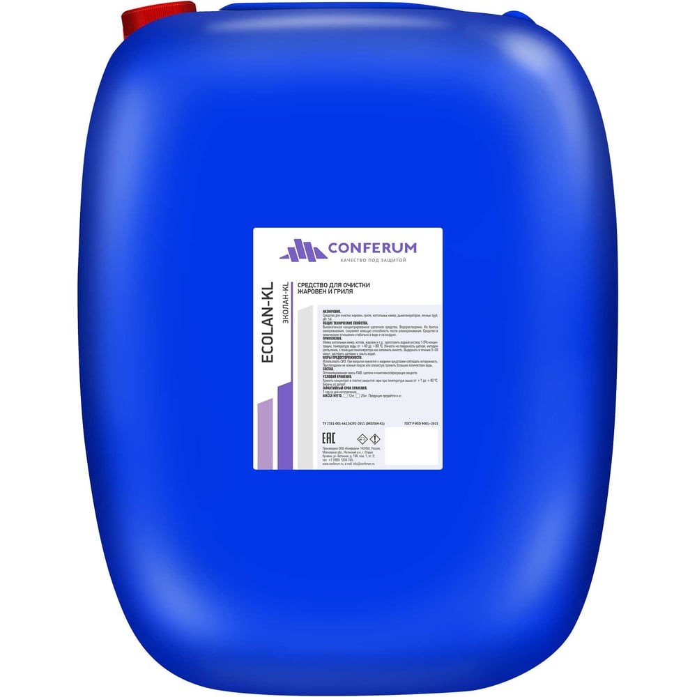 Средство для очистки термического, коптильного оборудования и канализации КОНФЕРУМ Эколан KL 0256 подходит для чистки коптильных камер, дымогенераторов, гриля, печных труб, прочистки и профилактики заторов в сточных и канализационных трубах. Не боится замораживания, сохраняет моющую способность после размораживания. Средство в химическом отношении стабильно в воде и на воздухе. Не допускается смешивание с другими моющими средствами. Порядок использования: Мойка коптильных камер. Приготовить водный раствор 1,5-4% концентрации, температура воды 40-60°С. Нанести на предварительно разогретую поверхность щеткой, методом распыления, с помощью пеногенератора. Выдержать рабочий раствор в течение 5-20 минут, растереть щетками и смыть водой (желательно теплой). Для автоматической мойки руководствоваться инструкциями для данного оборудования. Мойка котлов для варки, жаровен. Заполнить емкость 1-5 % раствором средств а, температура раствора 30-80°С Выдержать 5-30 минут, при необходимости растереть, а затем тщательно промыть водой. Можно использовать пенную технологию. Прочистка канализационных стоков. Залить в сток от 5% раствор или концентрат средства. Выдержать 5 30 минут, затем промыть большим количеством воды.
