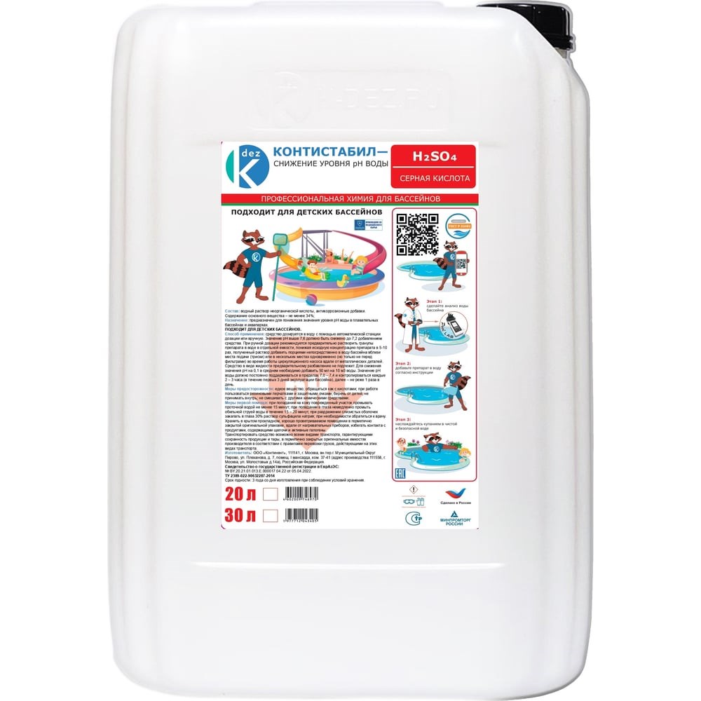 Средство для регулирования pH ООО Континент КОНТИСТАБИЛ pH минус, 20 л 1977712043368 предназначено для регулировки значения уровня pH воды в плавательных бассейнах и аквапарках. Отличается экономичным расходом, за счет чего средства хватит на долгий срок. Не содержит агрессивных ПАВ, благодаря чему безопасно для обрабатываемой воды. Средство полностью разлагаемо, поэтому не вредит окружающей среде. Меры предосторожности: Едкое вещество. Обращаться как с кислотами. При работе пользоваться резиновыми перчатками и защитными очками. Беречь от детей. Не принимать внутрь. Не смешивать с другими химическими средствами. При попадании на кожу и глаза немедленно промыть большим количеством воды, при необходимости обратиться к врачу. Условия хранения: Хранить в крытом прохладном, хорошо проветриваемом помещении в герметично закрытой оригинальной упаковке, вдали от нагревательных приборов; избегать контакта с продуктами, содержащими щелочи и активные галогены. Средство в виде гранул беречь от влаги.