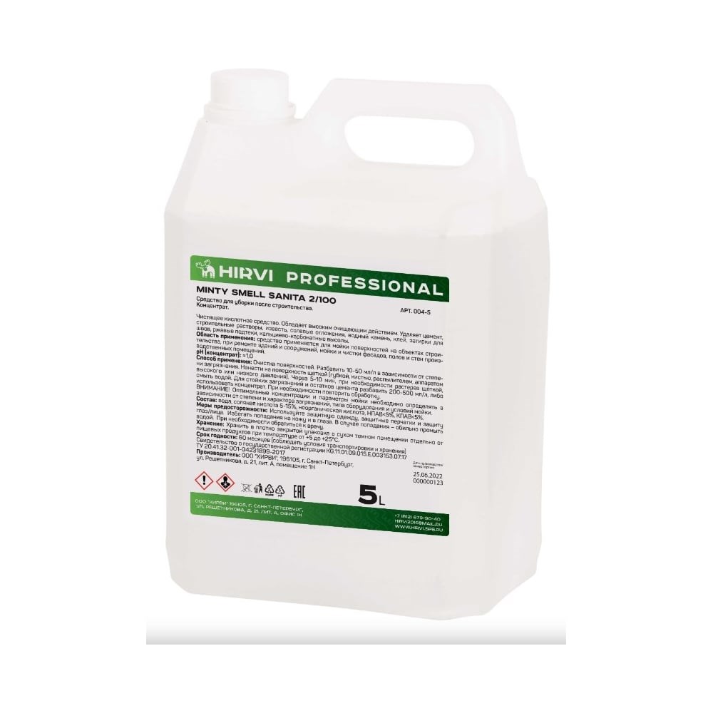 Средство для уборки после строительства HIRVI Minty smell sanita 5 л 321а123 - чистящее кислотное средство. Обладает высоким очищающим действием. Удаляет цемент, строительные растворы, известь, солевые отложения, водный камень, клей, затирки для швов, ржавые подтеки. Применяется для мойки поверхностей на объектах строительства, при ремонте зданий и сооружений, мойки и чистки фасадов, полов и стен производственных помещений.