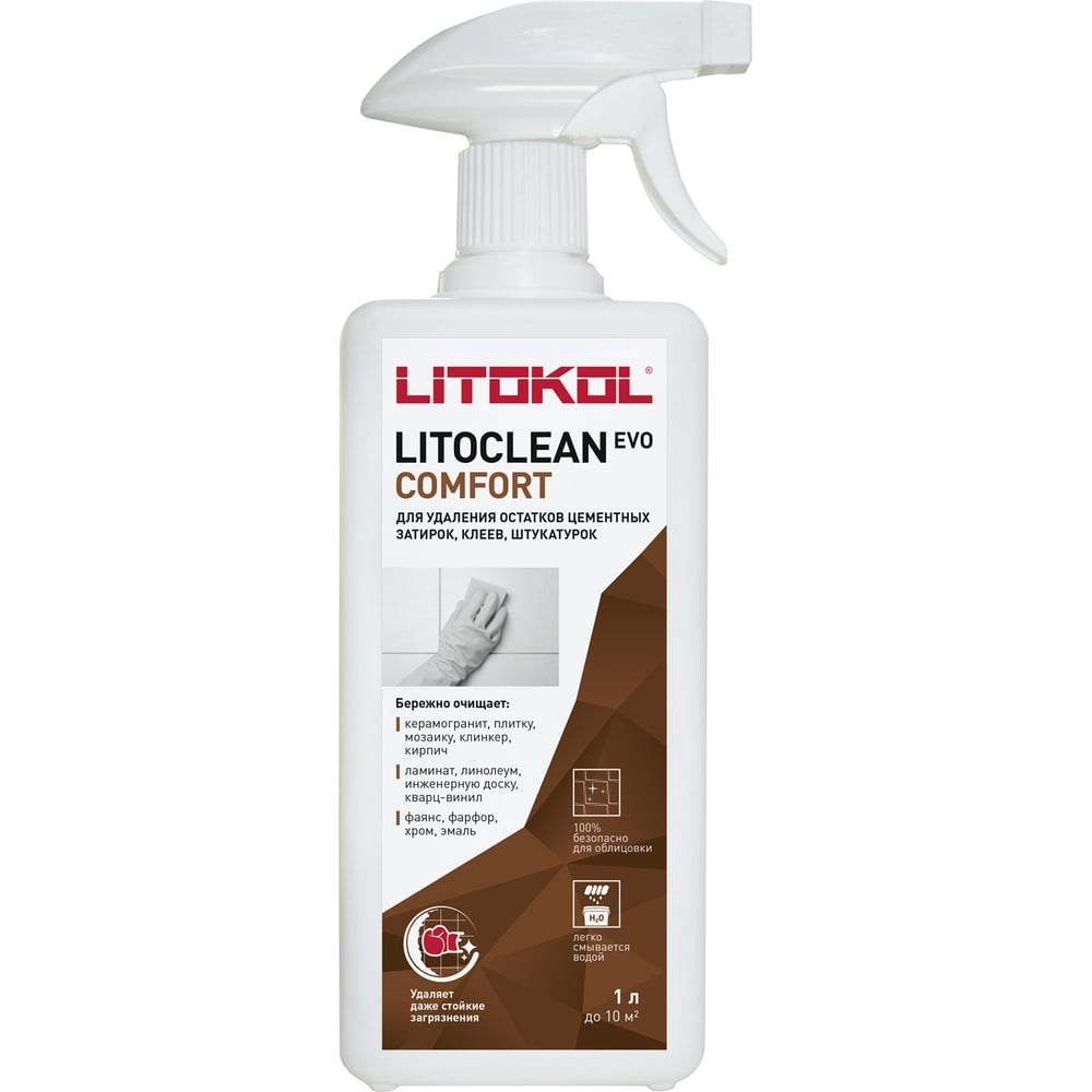 LITOCLEAN COMFORT EVO - средство для очистки облицованных поверхностей от остатков цементных растворов (затирок, клеев, штукатурок и т.д.).Применяется для очистки облицовки внутри и снаружи помещений любого типа от остатков цементного клея или цементных затирок; солевых отложений, цементных и известковых пятен. Подходит для удаления остатков цементных растворов с различных поверхностей, для очистки кирпичных стен от следов бетона, остатков кладочного раствора, для уборки помещений после проведения строительных и ремонтных работ.Очистку поверхности от остатков цементных рекомендуется проводить не ранее, чем через 5-7 дней, после окончания работ по затирке межплиточных швов. Очистку поверхности цементных штукатурок и бетонных конструкций от высолов рекомендуется проводить не ранее, чем через 28 дней (после окончания периода созревания).Типы облицовки: керамическая плитка, керамическая и стеклянная мозаика, керамогранит, керамогранитная мозаика, искусственный камень, кирпич, клинкер.Расход средства зависит от типа поверхности, объёма и сложности загрязнений - 100-300 г/м².Совместимо со всеми цементными продуктами LITOKOL.Перед применением необходимо ознакомиться с инструкцией.