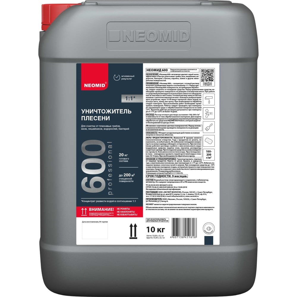Состав для эффективного и быстрого удаления плесени внутри и снаружи помещений. Мгновенно удаляет серый налет, эффективно и быстро уничтожает грибы, мхи, лишайники, водоросли, бактерии с бетона, кирпича, камня и других минеральных поверхностей.