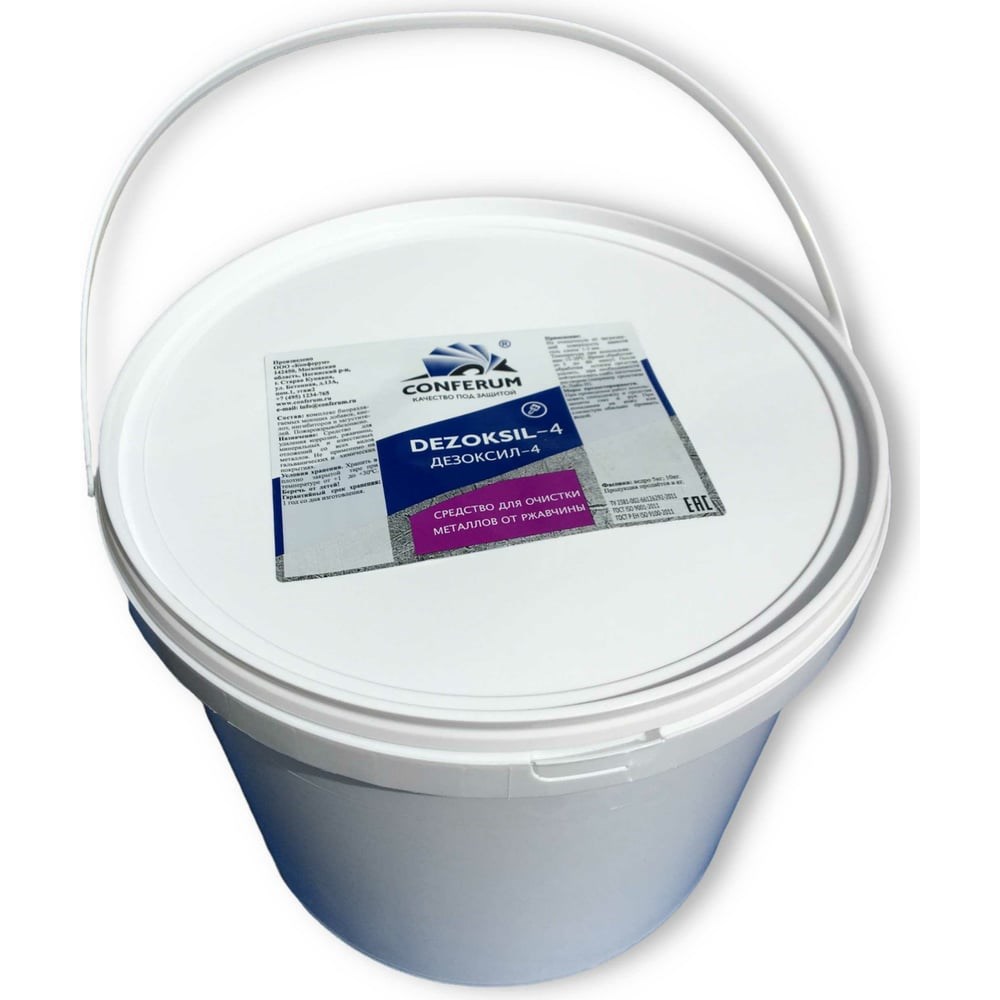 Средство для удаления ржавчины КОНФЕРУМ Дезоксил-4 1274 предназначено для очистки металлических поверхностей - удаления коррозионных налетов, ржавчины, окисных пленок, минеральных и известковых отложений перед окрашиванием или перед каким либо другим защитным покрытием. Средство имеет экономичный расход, благодаря чему его хватит на долгий срок. Полностью разлагаемо, поэтому безопасно для окружающей среды. Способ применения: Перед применением средства необходимо с поверхности металла удалить имеющиеся загрязнения (пыль, сажу, нефтемасляные загрязнения, смазки). Перед применением гелеобразное средство перемешать. Время обработки подбирается в зависимости от количества и структуры загрязнения - от 5 до 60 минут. По истечению времени обработки гель удалить жесткой обтирочной салфеткой(ветошью), жидкое средство - смыть водой.