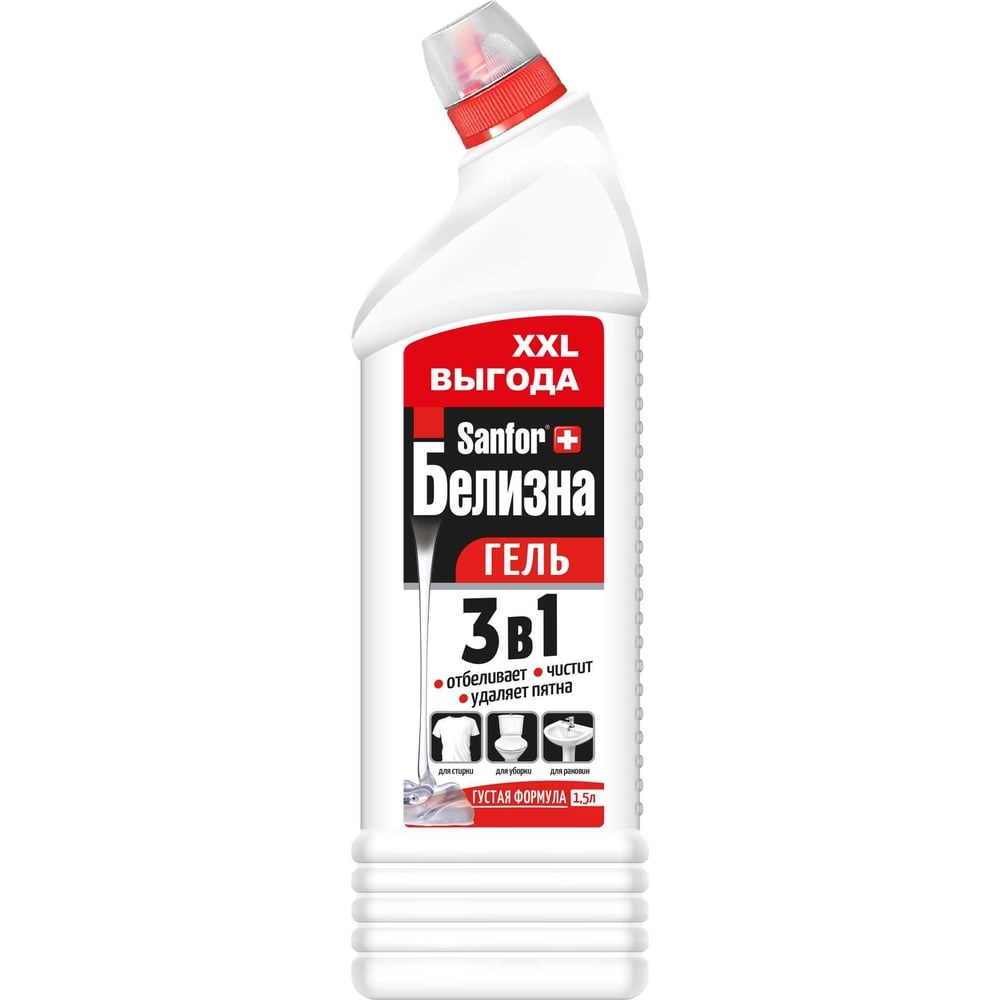 Белизна гель 3 в 1 от Санфор - отбеливающее, дезинфицирующее и чистящее средство в одной бутылке для профессионального (отели, офисы, торговые центры, детские и медицинские учреждения) и домашнего использования (ванна, туалет, душевые кабины, кухня, стоки, сливные отверстия). Универсальная жидкая концентрированная формула позволяет использовать ее как отбеливатель для стирки, моющее средство для полов, ванны и других поверхностей, а также как антибактериальное средство для унитаза. Устранение неприятных запахов, антимикробная обработка поверхностей и предотвращение появления известкового налета и мочевого камня.