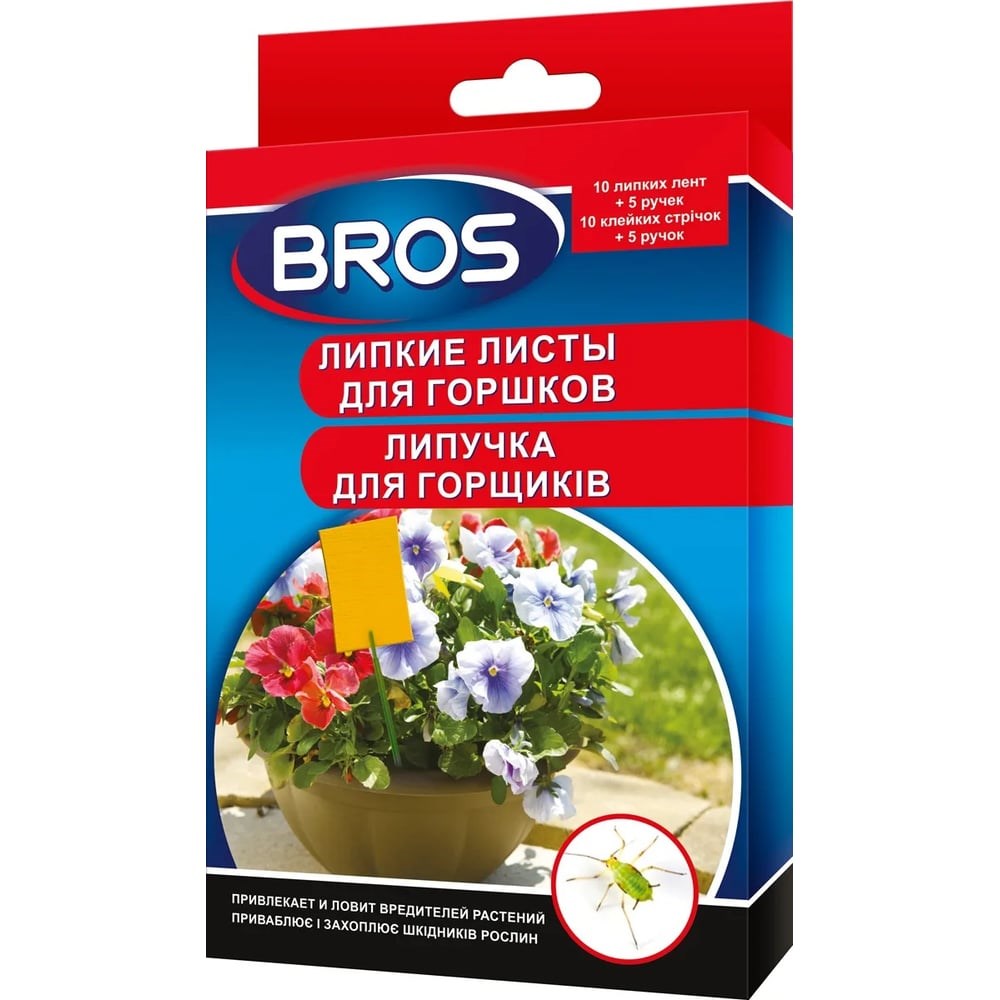 Клеевая ловушка от насекомых Bros для горшков с держателями, желтая, 10 штук 725533 эффективно борется с белокрылкой, грибным комариком, летающей листовой вошью, мухой-минером, трипсами и другими насекомыми. Для удобного использования в комплекте идут держатели для листков.