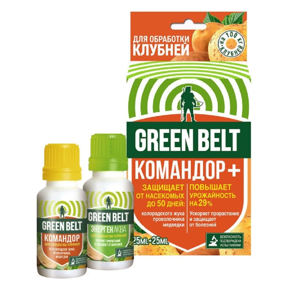 Защита картофеля от насекомых Грин Бэлт командор + энерген, 2 флакона х 25 мл, 01-917 – это комплект эффективных препаратов для обработки клубней картофеля перед посадкой.Командор защищает от проволочника, медведки и колорадского жука.Энерген ускоряет прорастание клубней и защищает от болезней.Средства увеличивают урожайность картофеля на 29%.1 литр раствора рассчитан на 100 кг семенного картофеля