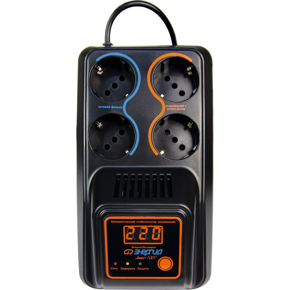 Стабилизаторы напряжения Энергия Люкс предназначен для защиты персональных компьютеров, аудио-видеоаппаратуры, офисной техники и другого оборудования небольшой мощности. Особенностью данного стабилизатора является совмещение функций стабилизатора и сетевого фильтра. Прибор прост в эксплуатации и оснащен четырьмя евро розетками, две из которых работают только в режиме «сетевой фильтр», а две другие – «стабилизатор + сетевой фильтр».Автоматический стабилизатор напряжения Энергия Люкс предназначен для поддержания стабильного напряжения в бытовых электросетях с номинальным напряжением 220В. Устройство имеет несколько уровней защиты подключенного оборудования. После устранения причины, приведшей к срабатыванию защиты, устройство будет автоматически перезапущено, и на выходные цепи будет подано стабилизированное напряжение.Корпус из негорючего ударопрочного пластика.Цифровые измерительные приборы, индикация режимов.Катушка трансформатора серии «компакт».Блок регулировочных реле мгновенно выравнивает колебания сетевого напряжения.Функция задержки включения.Евророзетки и еврошнур с заземляющими контактами.2 розетки работают только в режиме «сетевой фильтр», а две другие – «стабилизатор + сетевой фильтр».Виды защитыЗащита от пониженного напряжения.Защита от повышенного напряжения.Тепловая защита.