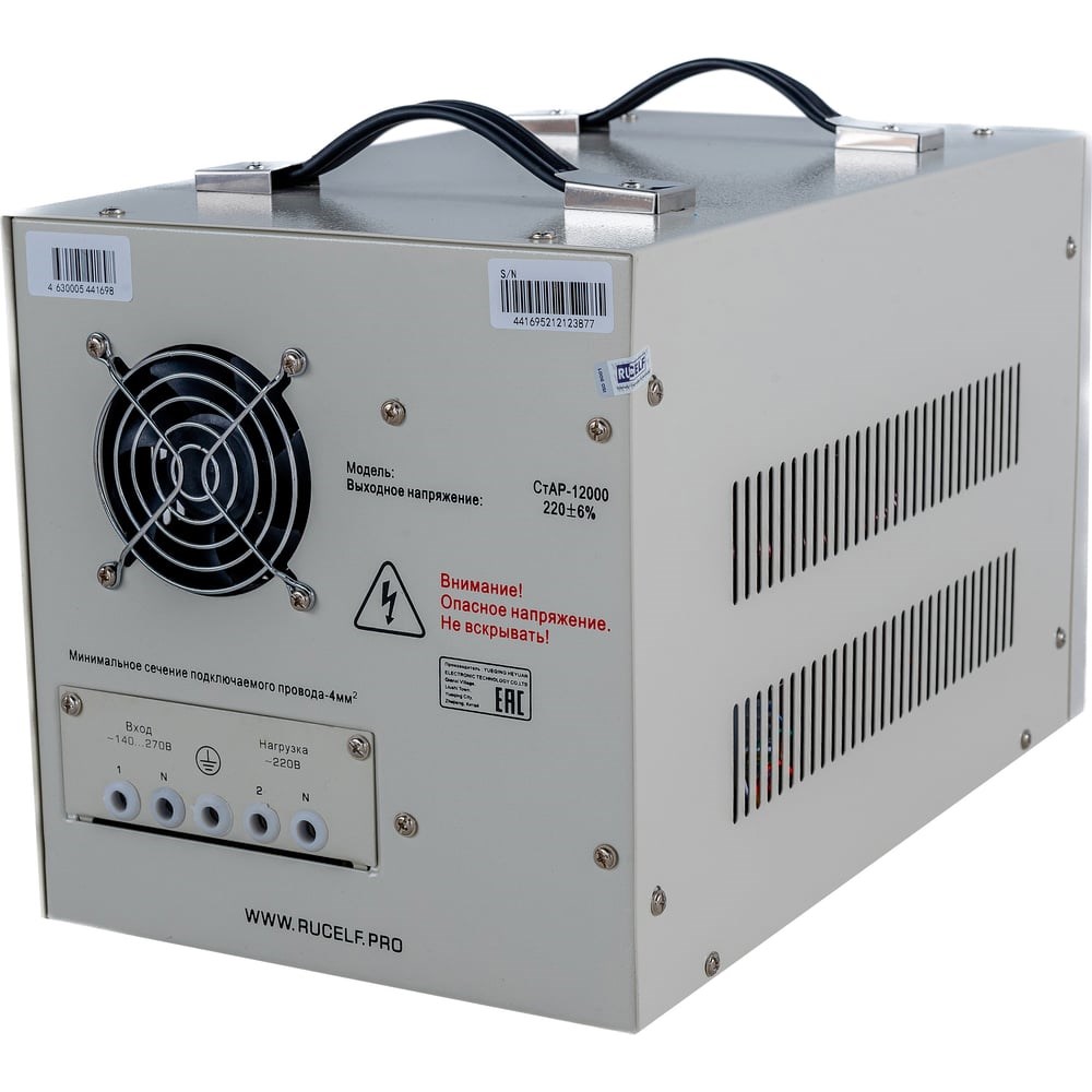 Стабилизатор напряжения Rucelf СтАР-12000 00002049 - однофазное устройство, которое нашло свое применение в квартирах, офисах и частных домах для защиты электроприборов с суммарной мощностью до 12 кВт от регулярных перепадов сетевого напряжения. Отверстия, расположенные на корпусе аппарата, способствуют быстрому забору воздуха, необходимого для охлаждения. Цифровой дисплей позволяет осуществлять визуальный контроль работы прибора.
