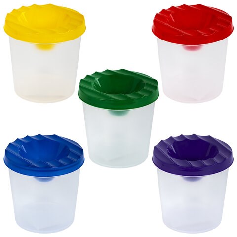 Стакан выполнен из прочного пластика. Линия на прозрачном корпусе указывает на максимально возможный уровень наполнения. Специальная форма крышки стакана исключает возможность вытекания воды. На крышке имеются углубления для размещения кисточек. Полный объем - 210 мл. Объем до уровня наполнения - 75 мл.