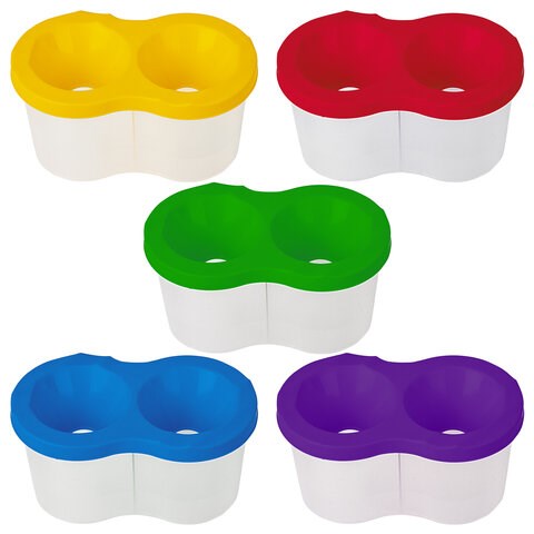 Стакан выполнен из прочного пластика и имеет 2 вместительных резервуара для воды. Линия на прозрачном корпусе указывает на максимально возможный уровень наполнения. Специальная форма крышки стакана исключает возможность вытекания воды. На крышке имеются углубления для размещения кисточек. Полный объем одного отделения - 150 мл. Объем до уровня наполнения - 50 мл.