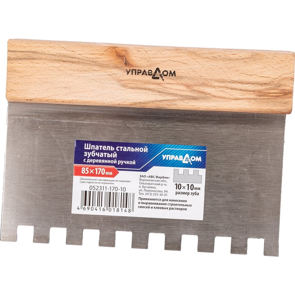 Стальной шпатель Управдом зубчатый, с деревянной ручкой, ширина 170 мм 4100002447 используется для отделочных работ. Шпатель позволяет равномерно нанести и распределить строительную смесь по поверхности. Полотно шпателя выполнено из качественной стали высокой прочности. Эргономичная деревянная рукоять обеспечивает комфортную эксплуатацию. Внимание! Изображение товара может отличаться от реального! Смотрите таблицу с техническими характеристиками!
