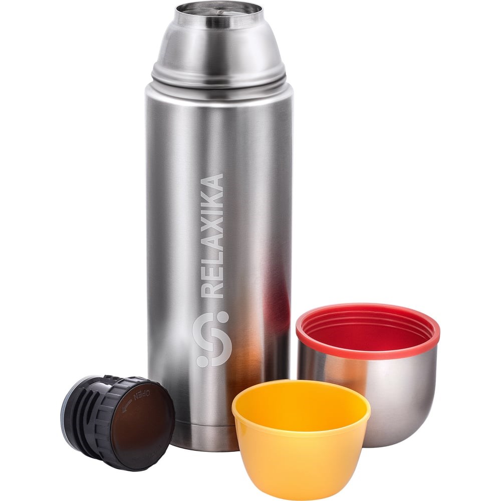 Термос Relaxika 102, 1 л, 2 чашки, стальной, R102.1000.1 обладает высокими показателями удержания температуры напитка. Пригодится в походах, путешествиях, на спортивных мероприятиях, а также подойдет для ежедневного использования. Термос имеет прочные двойные стенки, выполненные из высококачественной нержавеющей стали 18/8. Благодаря вакуумной изоляции напиток сохраняется холодным в течение 38 часов и горячим до 32 часов. Не содержит бисфенол, поэтому безвреден для здоровья.