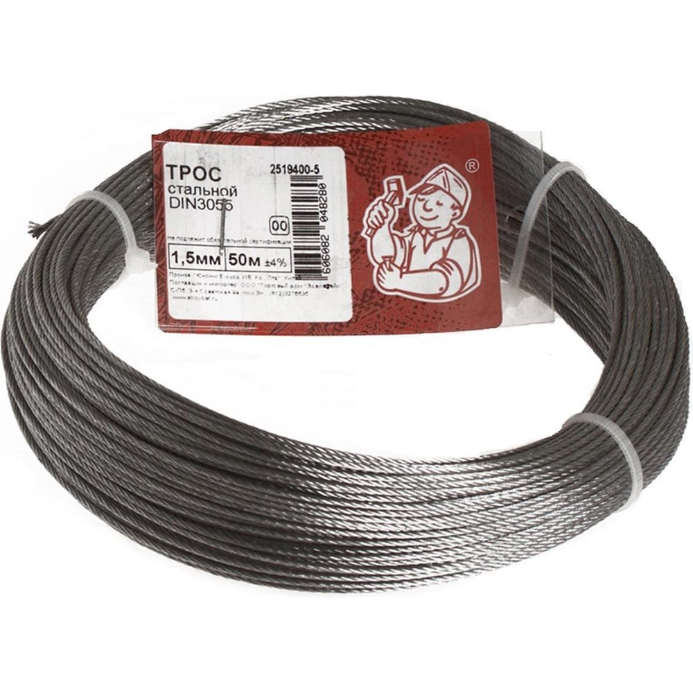 Стальной трос Стройбат DIN 3055, 1.5 мм, белый цинк, 50 м 276120