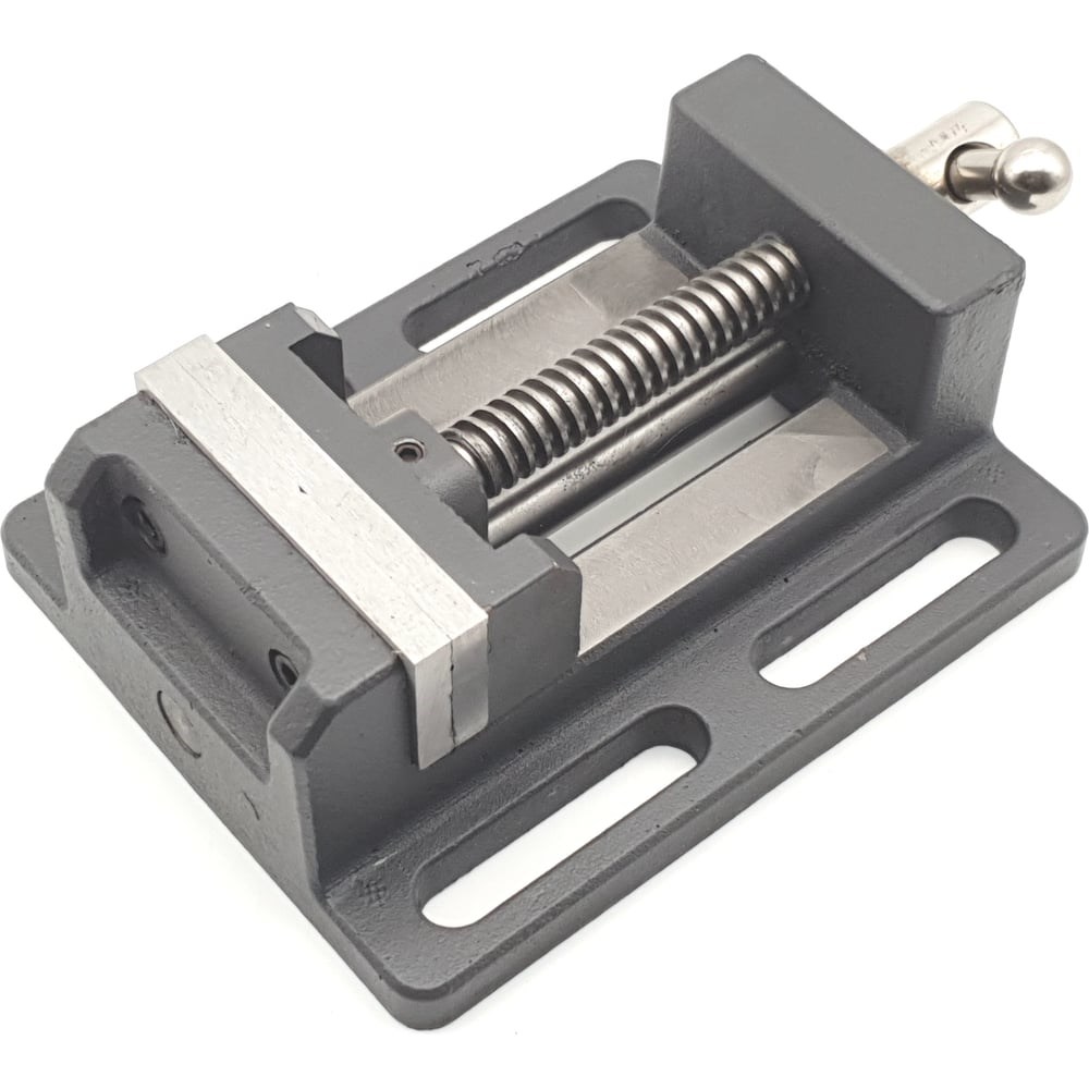 Станочные сверлильные тиски предназначены для использования на сверлильных станках, а также другом оборудовании. Благодаря установке на тиски направляющей оси, обеспечивается плавность хода без перекоса подвижной губки. Материал корпуса - чугун. Губки и винт изготовлены из стали.