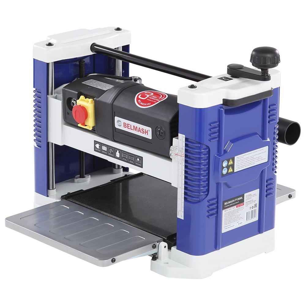 Станок рейсмусовый BELMASH P1800Lиспользуется для придания заготовкам заданной толщины.Онсочетает в себемобильность, производительность, надежность и сравнительно невысокую цену. Используется в небольших столярных мастерских.Особенности Мощный коллекторный двигатель 1800 Втс режимом работыS1Режущий вал снабжен двумя ножами сдвухсторонней заточкойКожух отведения стружки устанавливается на левую или правую стороныГранитный рабочий столКомпактный, с ручками для переноскиКонструкцияСтанок имеетлитоеоснование с отверстиями для крепления к верстаку.Рабочий стол изготовлен из гранита, расширители рабочего стола - из листовой стали.Сбоков основания расположенынесущие стойки, по которым перемещается платформа с ножевым валом и двигателем.Привод устройства ― однофазный коллекторный электродвигатель мощностью 1800 Вт. Станок оснащен защитой от перегрузки – автоматическим выключателем. Выключатель автоматически отключит станок при чрезмерном потреблении тока, что позволит предотвратить выход из строя оборудования или его компонентов. Автоподача осуществляется подпружиненными обрезиненными роликами. В сновании станка предусмотрены специальные монтажные отверстия, которые позволяют закрепить его на ровной твердой поверхности. Наторцах станкарасположены ручки для переноски. В верхней части станка установлен протяжной ролик для возврата заготовкина следующий проход.