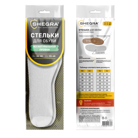 Стельки для обуви с российским размером RU 34-45, что соответствует европейскому размеру EU 35-46. На стельках указаны оба стандарта размера: RU и EU, а также нанесены линии выреза. Для удобства на упаковке приведена таблица соответствия размеров RU/EU. Натуральная пробковая основа стельки обеспечивает амортизацию стопы при ходьбе, эффективно снижая нагрузку на нее. Дышащее махровое покрытие отлично впитывает влагу и помогает надолго сохранять свежесть у Вас в обуви. Верхний слой делает стельки мягкими и удобными для повседневной носки. Обрежьте стельку по нанесенному размеру Вашей стопы или по размерам стельки, имеющейся у Вас в обуви. Вложите стельку тканевой стороной вверх. В целях гигиены рекомендуется менять стельки раз в два месяца