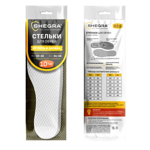 Стельки для обуви впитывающие от пота и запаха, КОМПЛЕКТ 10 пар, размер RU 33-45 / EU 34-46, с линиями выреза, SHEGRA (ШЕГРА), 700730