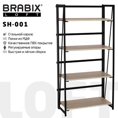 Стеллаж на металлокаркасе BRABIX "LOFT SH-001", 600х300х1250 мм, складной, цвет дуб натуральный, 641230
